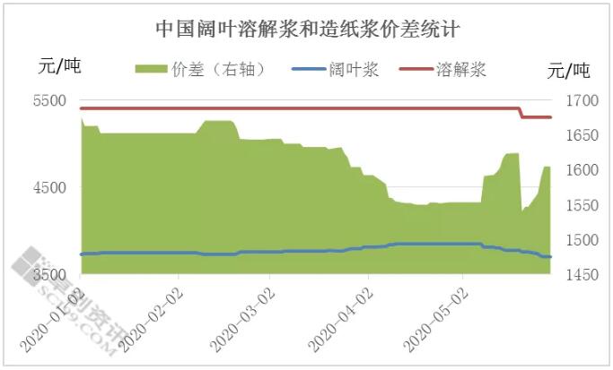5月國產溶解漿價格低位整理,闊葉溶解漿含稅到廠價5300元/噸,外盤價格亦弱穩運行,闊葉溶解漿外盤620-630美元/噸,針葉溶解漿650-655美元/噸,全球溶解漿廠家排產積極性不高,轉產造紙漿情況增多,為何造紙市場成為市場新方向,下面將從成本和需求端兩方面進行分析。