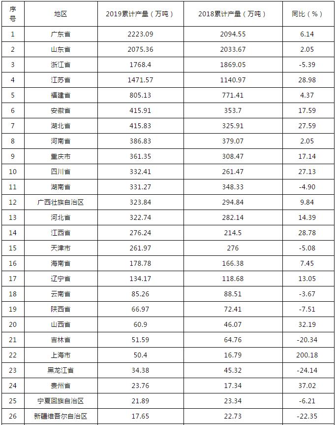 按行政區域劃分,2019年,廣東省實現產量2223.09萬噸,同比增長6.14%,排名************,山東省2075.36萬噸,同比增長2.05%,排名第二。產量超過1000萬噸的省份還有浙江和江蘇。四個省份產量合計占到全國總產量的60%。增速比較快的省份包括上海、貴州、山西、江西、湖北、江蘇和四川。
