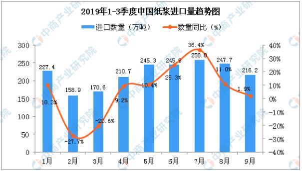 2019年1-3季度中國紙漿進(jìn)口量逐漸增長,增長29.63%。2019年9月中國紙漿進(jìn)口量為216.2萬噸,同比增長1.9%。