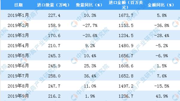 2019年1-9月中國紙漿進(jìn)口數(shù)量及金額增長率情況