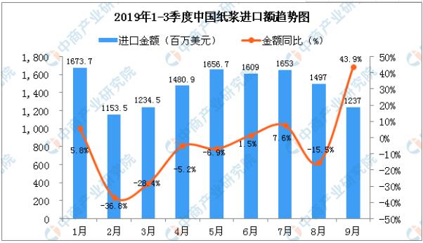 從金額方面來看,2019年9月中國紙漿進(jìn)口金額為1237百萬美元,同比增長43.9%。